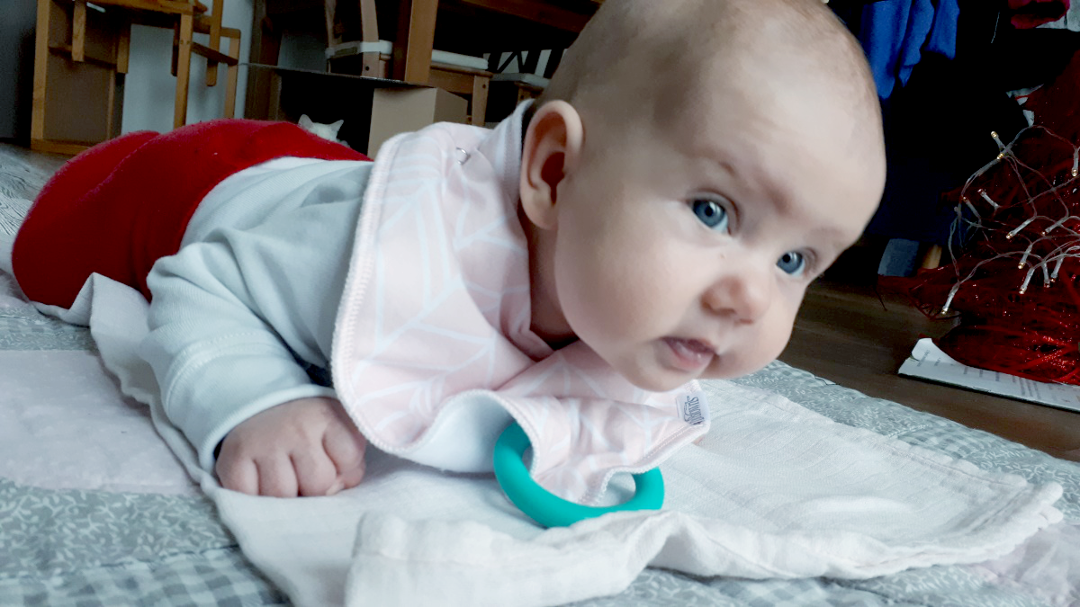 Balíček jsem otevřela a první, co Martinku zaujalo, byl bryndáček s kousátkem. Hned si jej chtěla nasazovat, proto jsme jej společně vyndali a k bryndáčku připnuli kousátko.